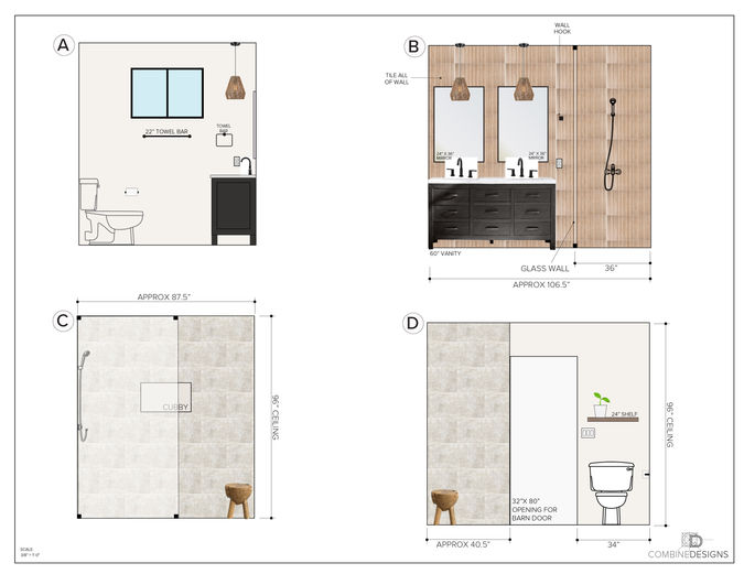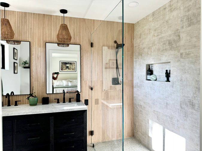 Unique custom bathroom. We completely rearranged this bathroom to make the flow better and create a large wheel chair accessible shower. We wanted a rustic modern feel so I found this porcelain tile that looks like wood slats. The contrast between the light wood and black creates beautiful drama in this bathroom.